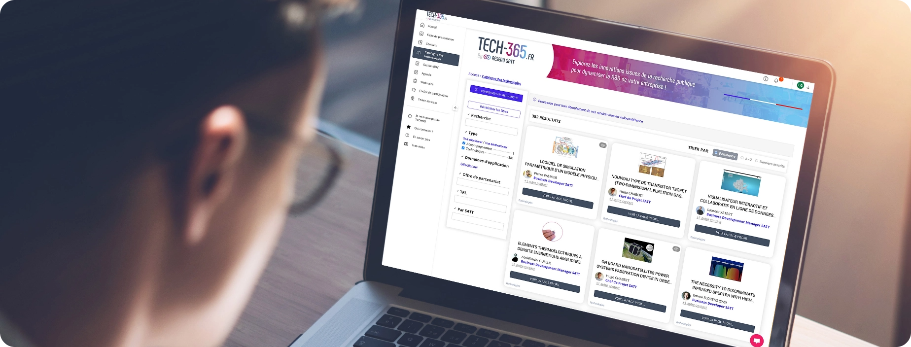 Tech-365.fr est une marketplace inédite qui regroupe l’ensemble des dernières innovations issues de la recherche publique qui ont bénéficié de la qualification d’une SATT ou d’un autre partenaire organisme de transfert de technologies (OTT). Avec votre abonnement annuel, vous avez accès en exclusivité à un catalogue de plus de 400 technologies régulièrement mis à jour et qui couvre l’ensemble des domaines d’application, et un accompagnement sur-mesure par nos responsables de filière.